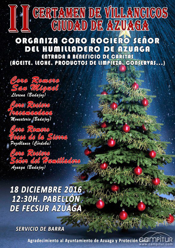 El domingo, 18 de diciembre, el Coro Rociero Señor del Humilladero de Azuaga organiza el II Certamen de Villancicos Ciudad de Azuaga, a partir de las 12:30 horas en el Pabellón de Fecsur.